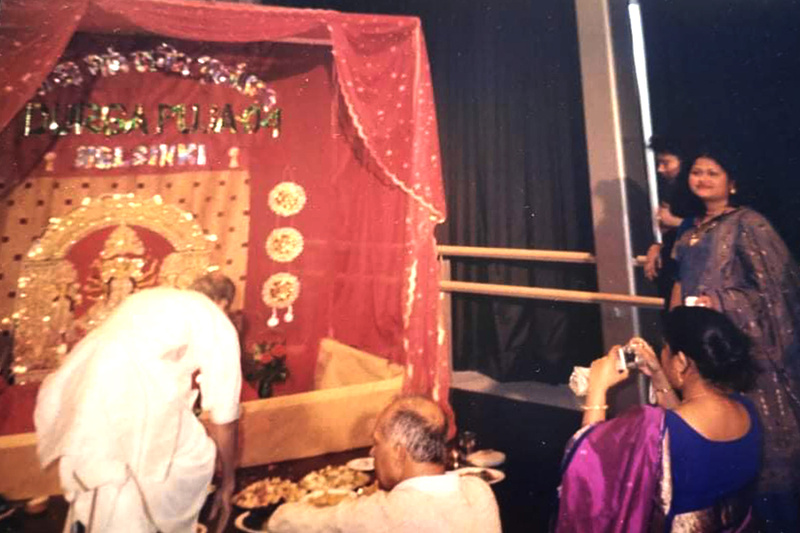 বিয়ের পরেই ২০০৩ সালের অক্টোবর মাসে ইসরাইল থেকে ফিনল্যান্ডে পৌঁছেছিলাম আমার হাসব্যান্ড ড: সৌরভ রায় এর কর্মসূত্রে। তখন হিমেল হাওয়ায় সব গাছের পাতা ঝরে গেছে, দুর্গাপুজোও সবে শেষ হয়েছে, আবার একটি বছরের অপেক্ষা। তবে Indian embassy থেকে দিওয়ালির অনুষ্ঠানের আমন্ত্রণ পেয়ে সেখানে গিয়ে দেখলাম দুর্গাপুজোর রেশ তখনও কাটেনি। অনেক ভারতীয় এবং বিশেষ করে বাঙালি দের সাথে আলাপও হয়ে গেলো। এরপর সারা বছর নানান অনুষ্ঠান পালন হতে হতে বহু প্রতীক্ষিত দুর্গাপুজো এসে গেলো। সেই সময় একই প্রতিমা প্রত্যেক বছর পুজো করা হতো। খুব ছোট হলেও সুন্দর ছিল মা দুর্গার সেই প্রতিমাটি। পূজার্চনার দায়িত্বে থাকতেন দুর্গাপুজোর অন্যতম উদ্যোক্তা আমাদের সবার প্রিয় শান্তিদা। দুর্গাপুজো উপলক্ষ্যে সবাই মিলে পুজোর বাজার করা, রান্না করা, সাংস্কৃতিক অনুষ্ঠান এর জন্য রিহার্সাল করা, পুজোর দিন পারফর্ম করা এসবের মধ্যে দিয়ে হইহই করে কাটত কটা দিন।