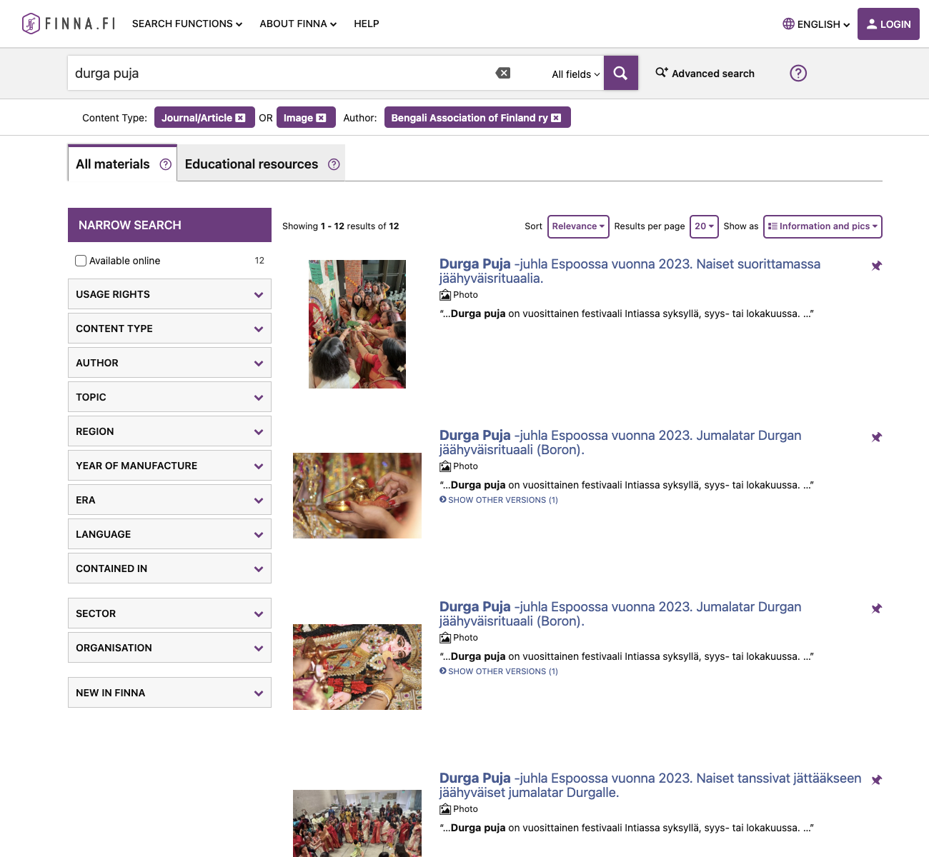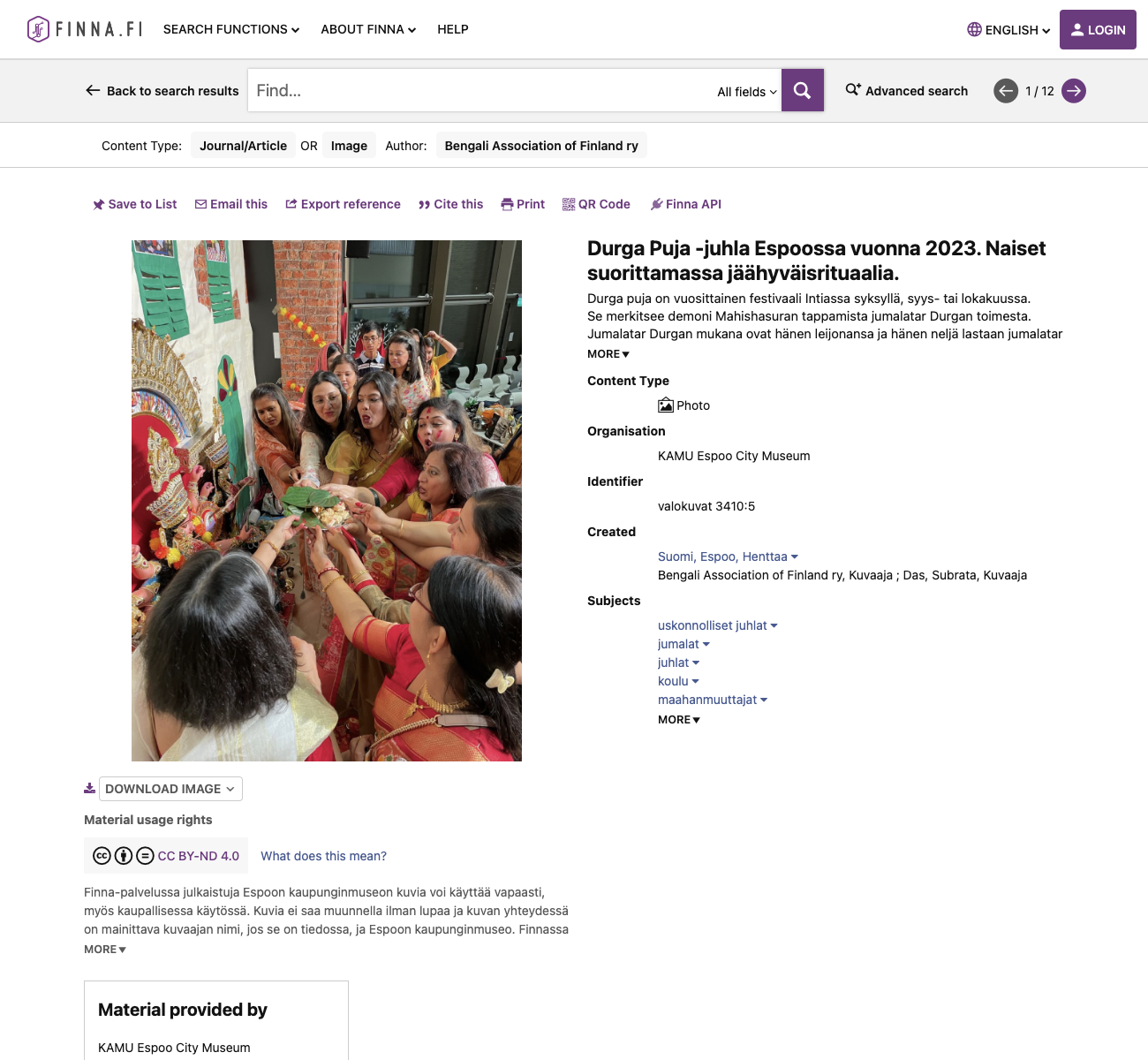For many years now, Durga Puja has been a topic of interest for many Finnish people. Bengali Association of Finland ry (established later), donated the first idol to the Helina Rautavaara Museum in 2016, where it has found it’s permanent place for display along with a VR audio-visual film and photos around the puja celebration in Finland from 2017. This project was led by the World Culture department, University of Helsinki during 2017. In recent years, the museum sector and heritage agencies have started taking an interest in immigrant communities and their culture. They have started documenting the customs of different communities as part of Finland’s intangible or living heritage. One of the pioneers in this venture is the KAMU Espoo City Museum. The museum regularly produces new research data and, as the data accumulates, new, interesting perspectives on Espoo’s history are sought. With its redevelopment program underway, KAMU is bringing current perspectives on the city, place and community into the discussion. As the Puja is being recently held in Espoo for the third time in a row, I convinced my colleagues that the Bengali community, especially Durga Puja is a part of the events of Espoo which needs to be recorded as part of contemporary documentation process. Subrata Das, a member of BAF ry donated Durga Puja photos from the year 2023 which was held in the Espoo International School to the museum. Finally, 12 photos which represented the spirit of Puja, were selected and became a part of their collection/archive. Additionally, these were uploaded in the Finna open access platform by KAMU (Finna is maintained and developed by the National Library of Finland), which is home to millions of items of cultural and scientific material in Finland.