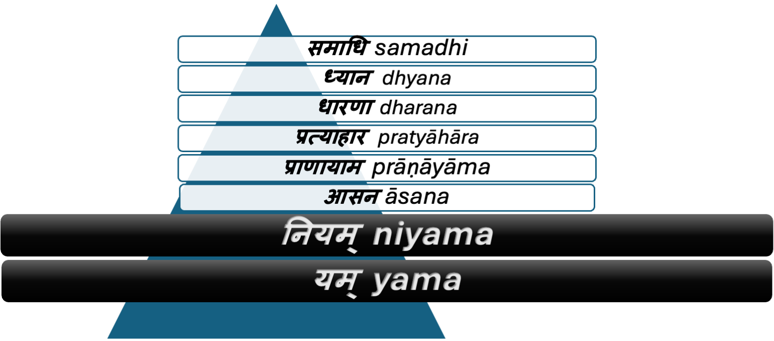 যদি আমরা ঋষি পতঞ্জলির (Patanjali, the ancient sage) যোগসূত্রের (yoga sutras) দিকে তাকাই, অষ্টাঙ্গ যোগ অন্তর্ভুক্ত অত্যন্ত জনপ্রিয় যোগ-আসন (Āsana; বসা এবং অন্যান্য ভঙ্গি) এবং প্রাণায়াম (Prāṇāyāma; প্রাণের নিয়ন্ত্রণ, উদাহরণ শ্বাস-প্রশ্বাসের নিয়ন্ত্রণ) আছে - এগুলির আগেও দুটি প্রাথমিক নীতি-শ্রেণীতে (ধাপ) নির্ধারিত আছে - প্রথম শ্রেণীটি যমর (yama) অধীন, দ্বিতীয় নিয়ম
