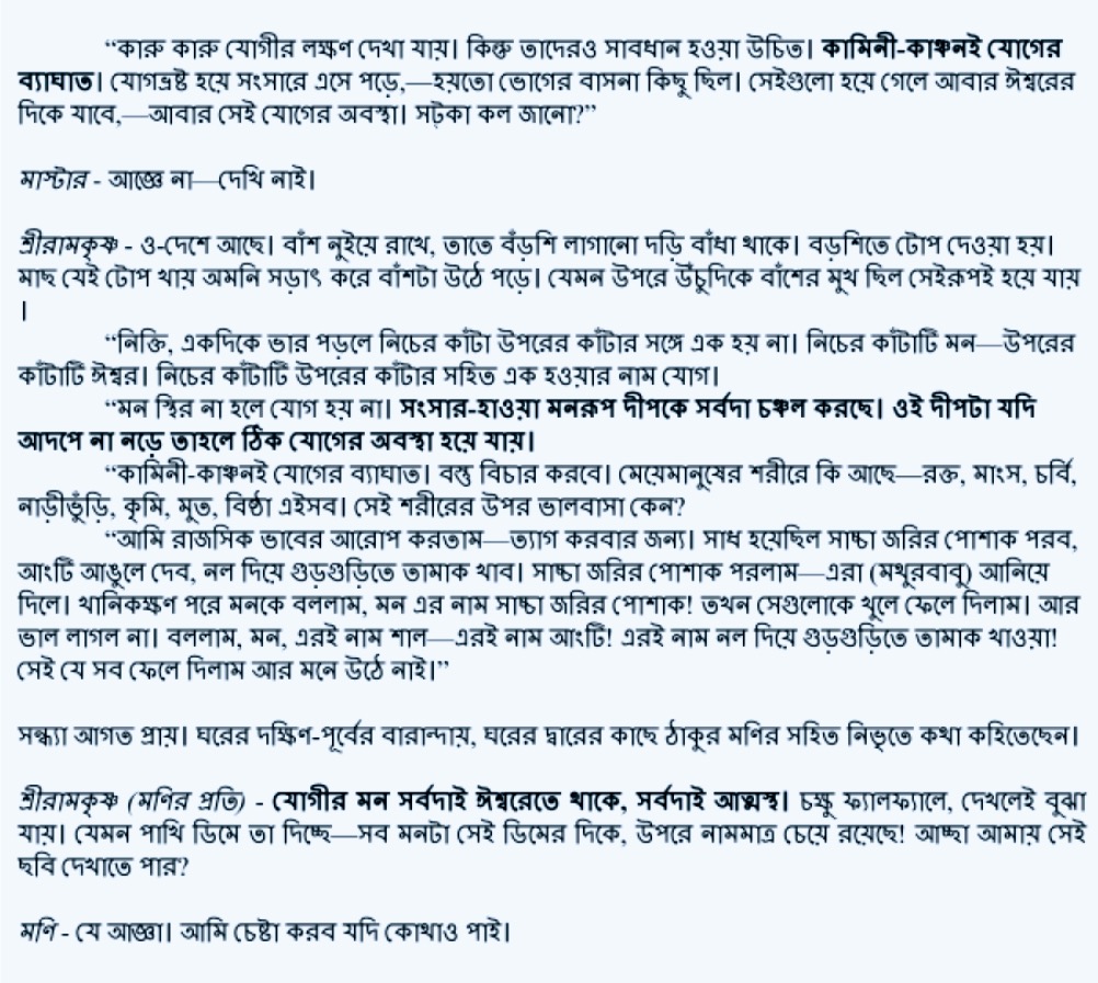 কামিনী বা কাম (lust) বলতে শ্রীরামকৃষ্ণ সকল প্রকার ইন্দ্রিয়সুখকেই বুঝিয়েছিলেন। আর, কাঞ্চন (gold) বলতে শ্রীরামকৃষ্ণ সকল প্রকার বস্তুগত সম্পদকেই বুঝিয়েছিলেন, যেমন অর্থ, সম্পত্তি । কথামৃতের অন্য এক জায়গায়, শ্রীরামকৃষ্ণ একজন প্রকৃত যোগী কেমন তার ব্যাখ্যা করেছেন । একজন সাধক/যোগী হয় সন্ন্যাসী (monastic, sage, monk) হতে, নয়তো গৃহস্থ (householder) হতে পারেন ।