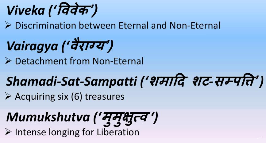 এবার অদ্বৈত বেদান্তের পথে চারটি অপরিহার্য প্রাথমিক যোগ্যতার দিকে নজর দেওয়া যাক । এগুলোকে “সাধন চতুষ্টয়” (साधनचतुष्टयम्; Sadhana Chatushtaya) বলা হয় এবং আমরা আদি শঙ্করাচার্যের বিবেক চূড়ামণিতে এগুলো খুঁজে পাই ।