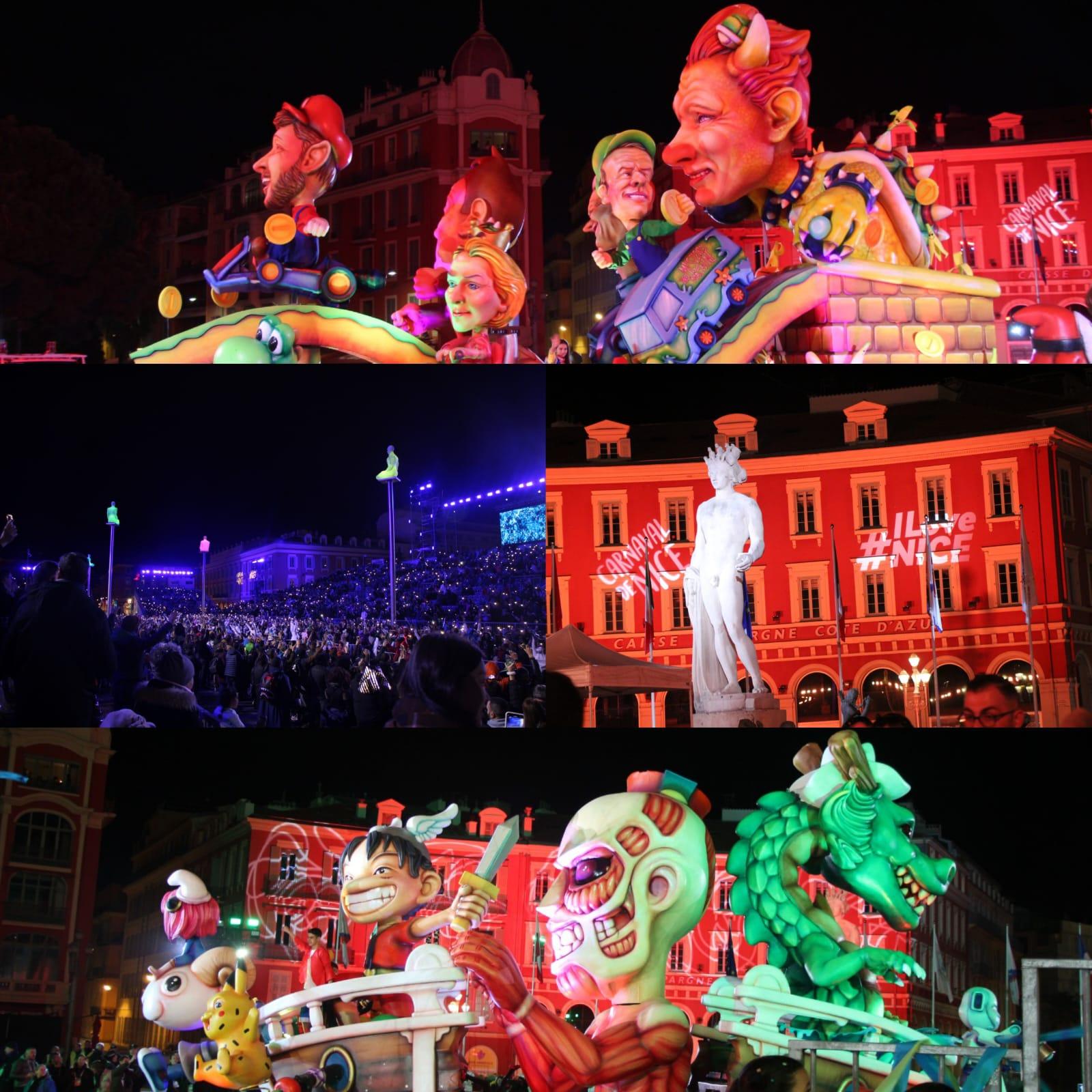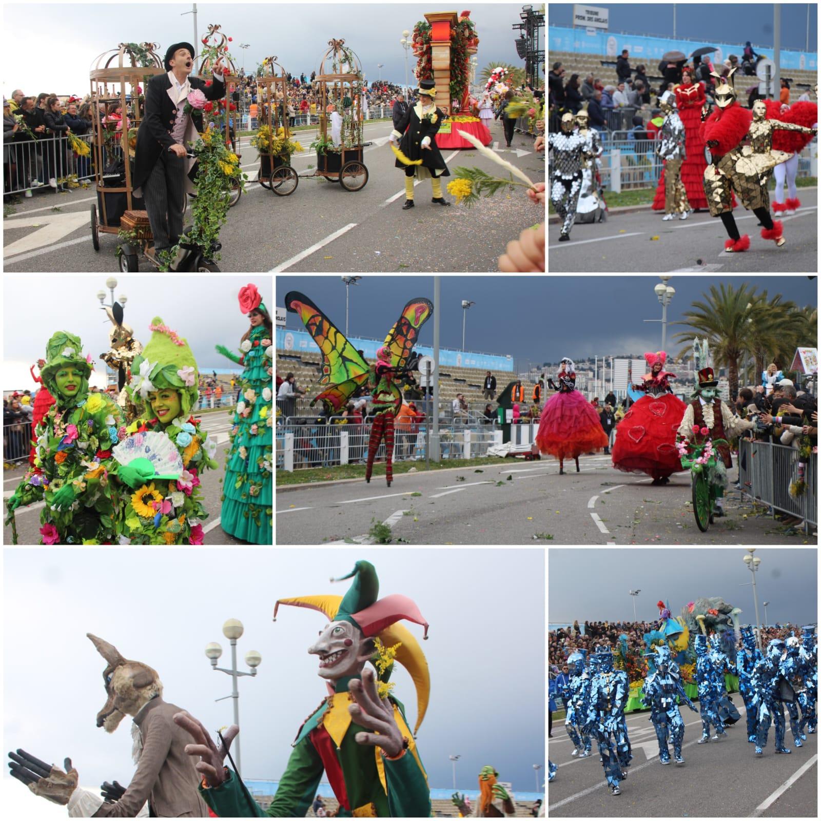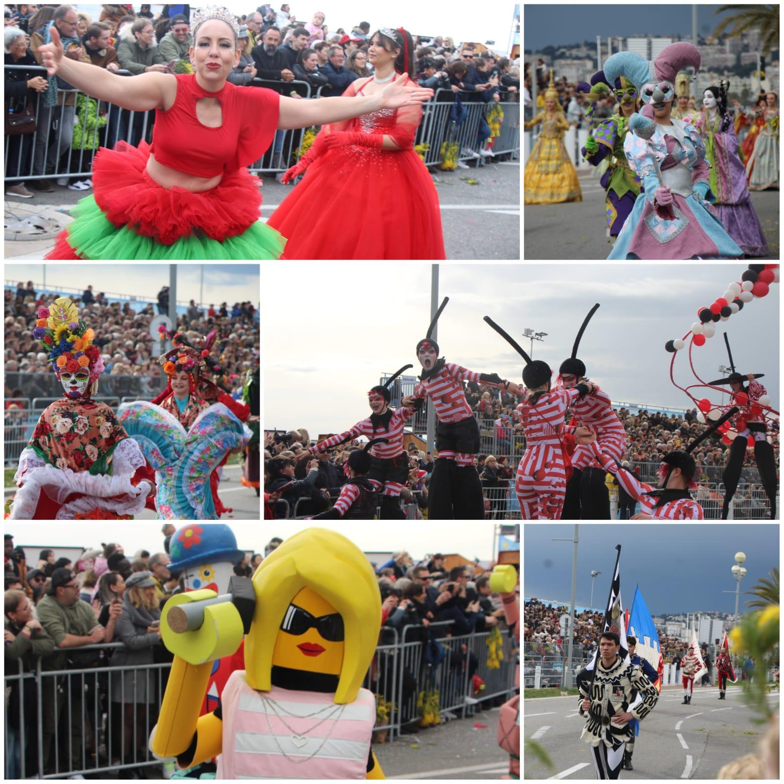 প্রতি বছর, একটি বিশেষ থিম বেছে নেওয়া হয় এবং শিল্পীরা রঙিন কুচকাওয়াজের জন্য traditional ঐতিহ্যবাহী 18 টি ভাসমান এবং অন্যান্য মূর্তি তৈরি করে। প্যারেডগুলি দিনরাত অনুষ্ঠিত হয়, যখন Promenade des Anglais, “ফুলের লড়াই” ঘটে।