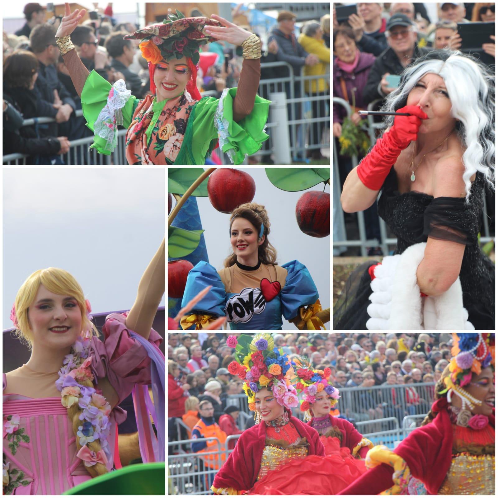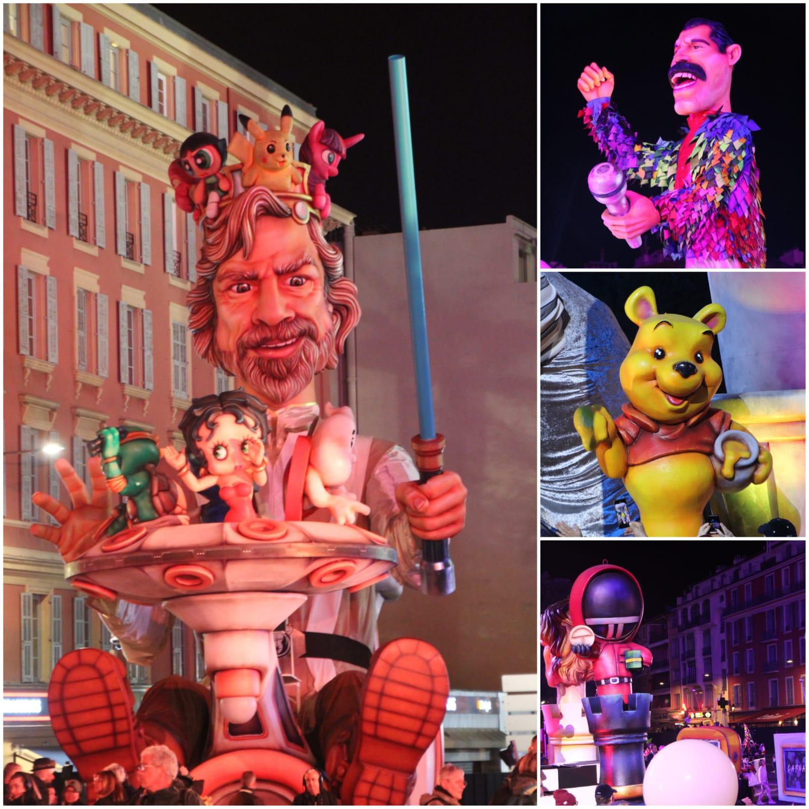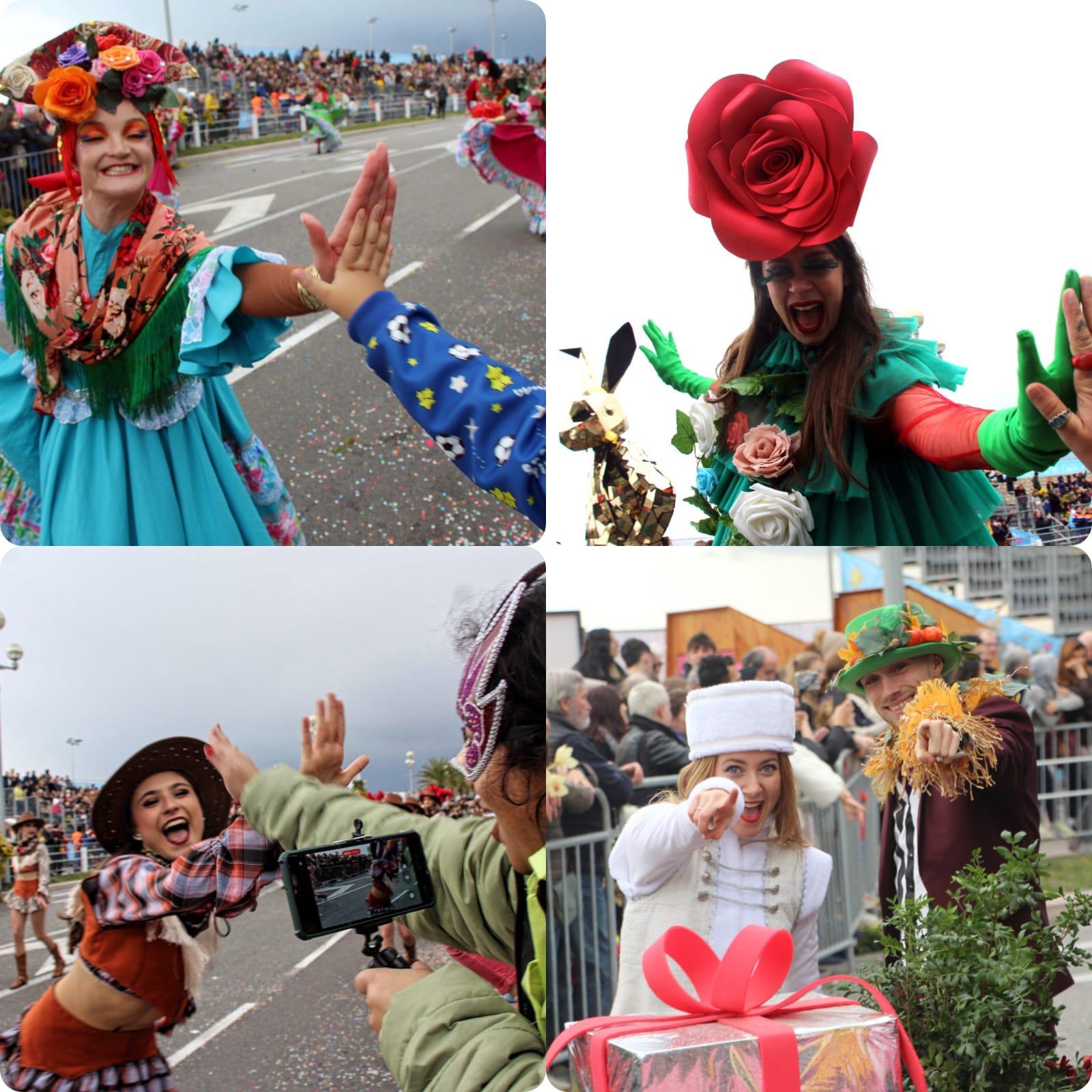 প্রতি বছর, একটি বিশেষ থিম বেছে নেওয়া হয় এবং শিল্পীরা রঙিন কুচকাওয়াজের জন্য traditional ঐতিহ্যবাহী 18 টি ভাসমান এবং অন্যান্য মূর্তি তৈরি করে। প্যারেডগুলি দিনরাত অনুষ্ঠিত হয়, যখন Promenade des Anglais, “ফুলের লড়াই” ঘটে।